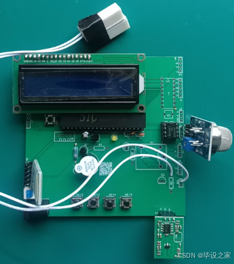 在完成软件调试并生成HEX文件后,我进入了硬件调试阶段。首先,根据系统设计的电路图,我仔细焊接了所有硬件组件,包括单片机、传感器模块、报警器、LCD显示屏以及蓝牙模块等。焊接完成后,我使用万用表检查了电路的连接情况,确保所有引脚连接正确且无短路现象。实物图如下图5.2所示。