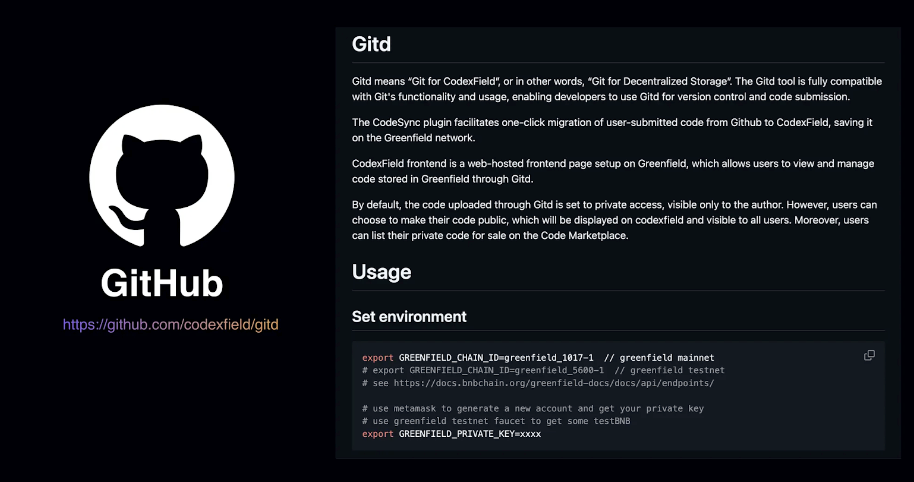 通过 Gitd,CodexField 将“版本管理”从中心化仓库迁移到去中心化环境中,并在此基础上构建了智能化的同步与迁移功能。例如,CodeSync 插件允许开发者一键将 GitHub 仓库内容同步至 CodexField 网络,实现无缝过渡与持久化存储。与此同时,CodexField 还提供了基于 Greenfield 托管的 Web 前端界面,使开发者能够在浏览器中直接查看、管理和发布自己的项目仓库。