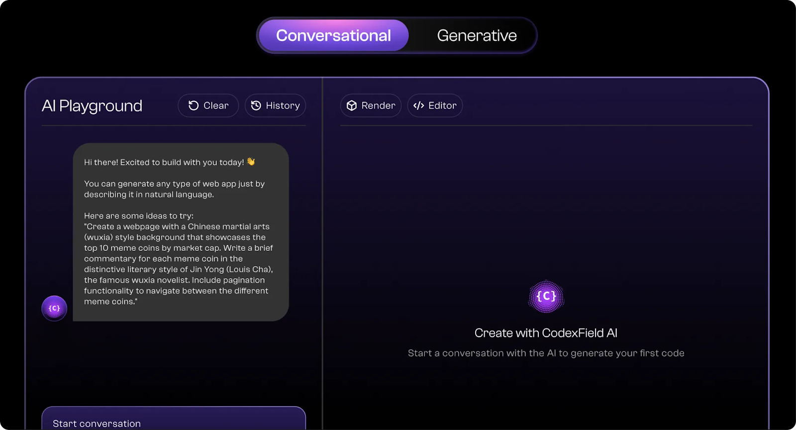 AI Playground 是 CodexField 生态的创作与创新核心,为开发者与创作者提供一个集模型调用、AI 应用生成、内容创作与二次开发于一体的开放平台。它与底层的 Gitd 与 Greenfield 网络深度联动,使用户能够直接在浏览器中访问算力、调用模型,并在链上实现作品的即时存储与确权。无论是生成文本与图像,还是搭建完整的 AI 应用,用户都能在同一环境中完成创作、测试与发布,形成从灵感到上架的全流程闭环。