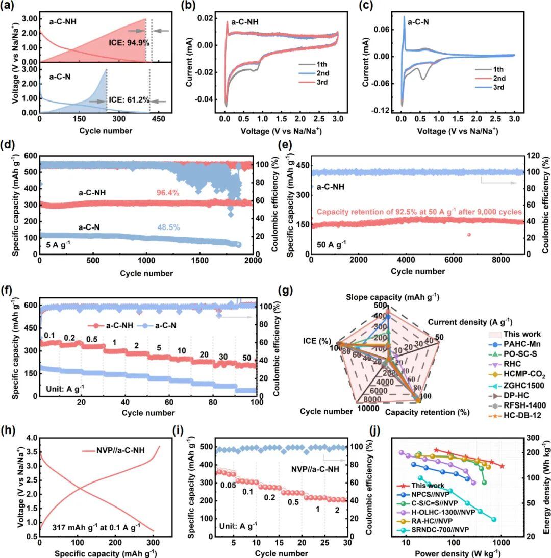钠离子电池的普及一直受制于硬碳负极材料的性能瓶颈:追求高倍率快充,就会牺牲初始效率与循环寿命。近日,中国科学院合肥物质科学研究院王佩瑶博士后及主要通讯作者赵邦传研究员、温州大学侴术雷/吴星樵团队与安徽工业大学何孝军团队在《ACS Nano》 上发表颠覆性研究成果。团队开发了一种氨基氮引导的贯通孔工程策略,成功破解了硬碳材料的层间束缚难题,制备的负极材料实现了94.9%的超高初始库仑效率,并在高达50 A/g的惊人电流密度下,仍能保持208.2 mAh/g的可逆容量,性能远超现有报道。该工作为推进钠离子电池的产业化应用提供了里程碑式的材料解决方案。
