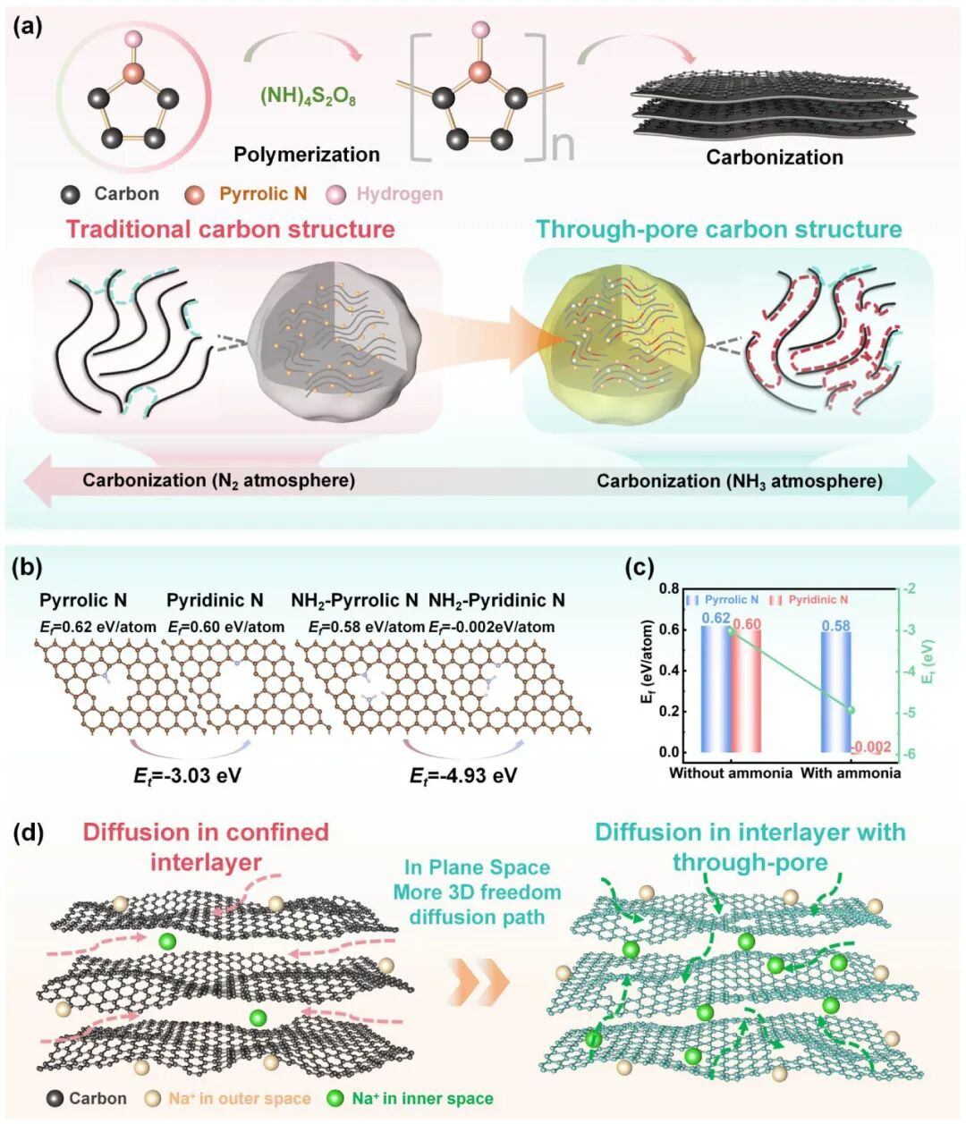 图1 设计机理:示意图清晰展示了如何通过气相辅助热解,在硬碳中构建垂直贯通孔道,并完成从不可逆吡咯氮向高可逆吡啶氮的转化,为钠离子开辟了高速扩散路径。