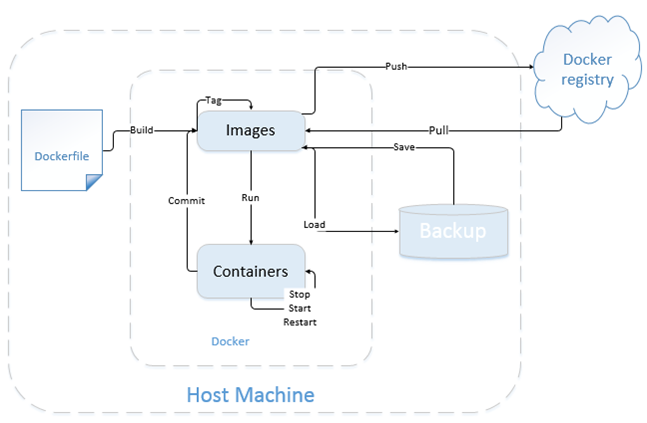 上图是一个image的简单使用。我们可以通过一个dockerfile来build自己的image。可以把image上传(push)到自己的私有镜像仓库,也可以从私有仓库pull到本地进行使用。可以单独使用命令行,直接run container,可以对container进行stop、start、restart操作。也可以对image进行save保存操作以及加载load操作,大家具体可以根据自己的使用,选择不同的操作即可。