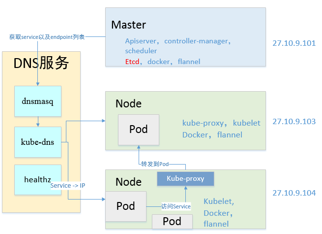 如下是我的集群部署策略,1个master + 2个node(minion1.2之前的叫法)。我的存储集群etcd是单点集群,不推荐此做法,你懂得,哈哈。网络使用的是flannel虚拟二次网络。