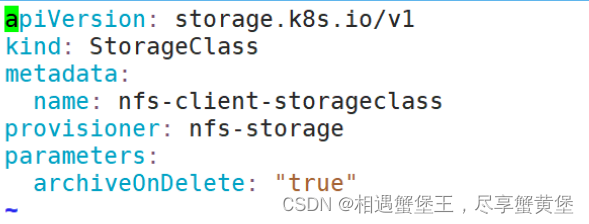 provisioner: nfs-storage #这里的名称要和provisioner配置文件中的环境变量PROVISIONER_NAME保持一致