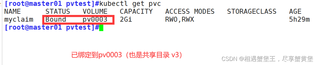 3、创建PVC资源,配置请求PV资源的访问模式和存储大小,绑定PV(一个PV只能绑定一个PVC)
