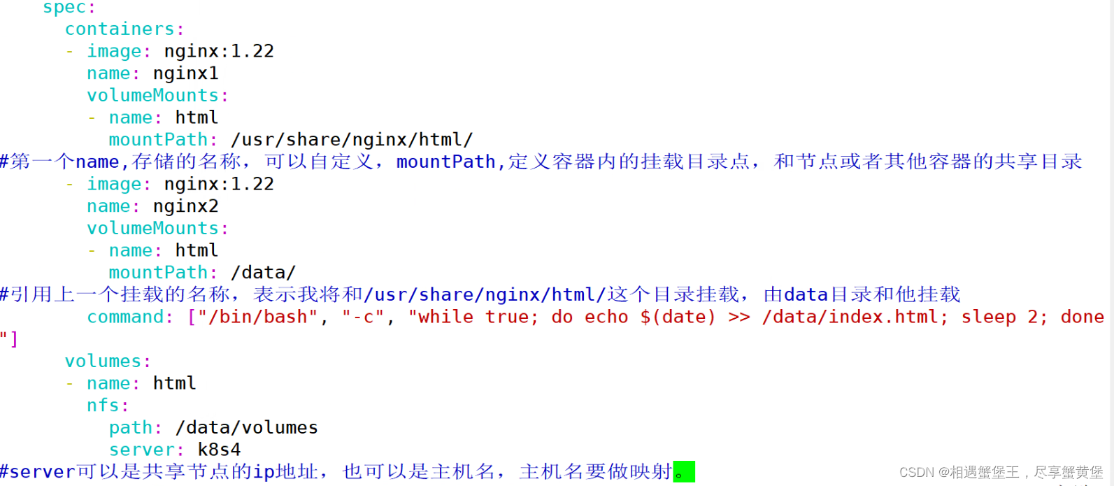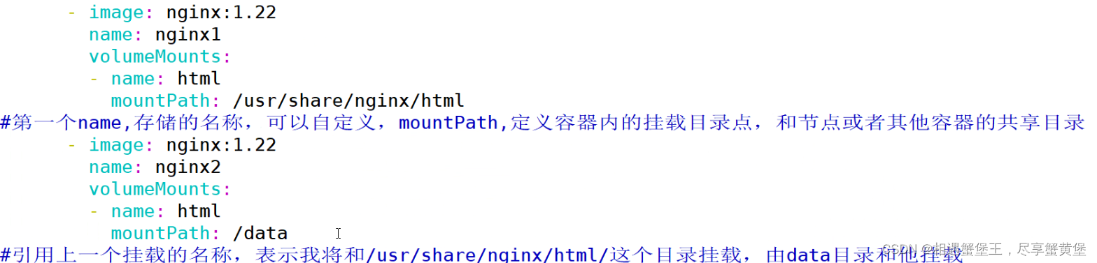 #使用的存储卷名称,如果跟下面volume字段name值相同,则表示使用volume的这个存储卷