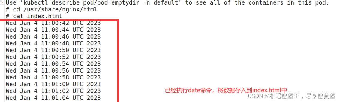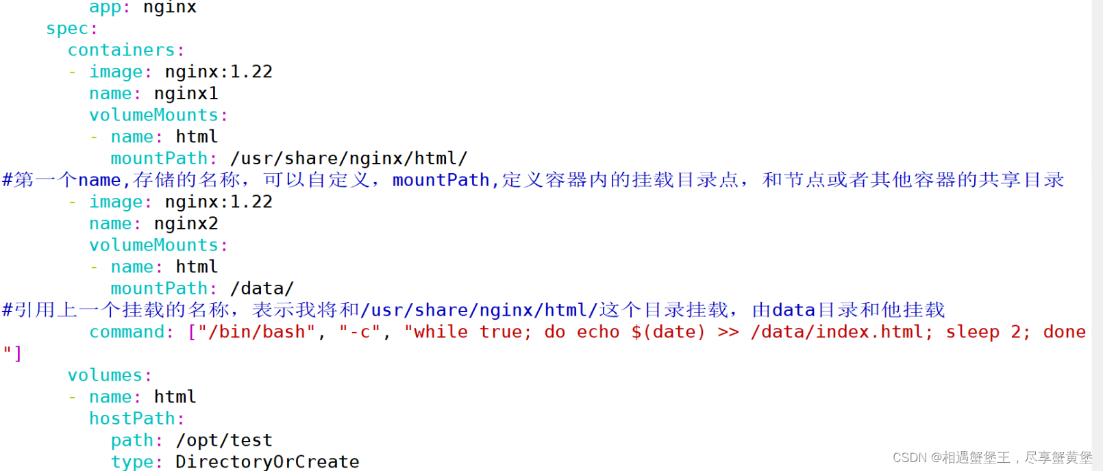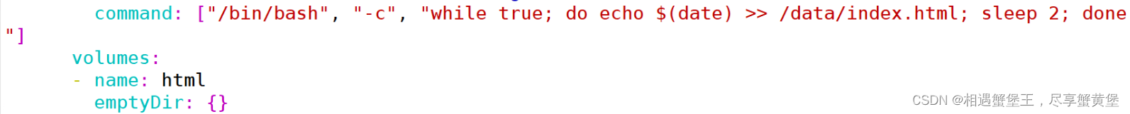 command: ['/bin/sh','-c','while true;do echo $(date) >> /data/index.html;sleep 2;done']