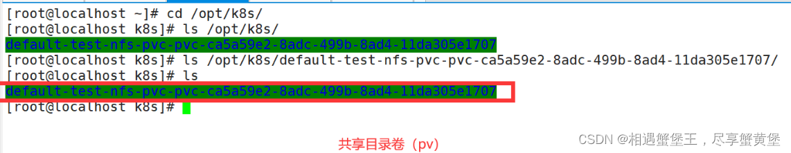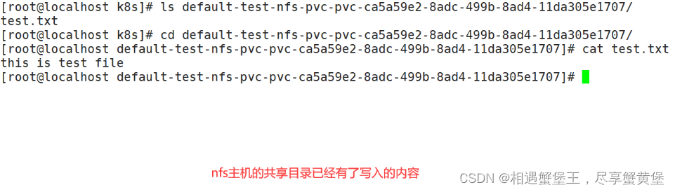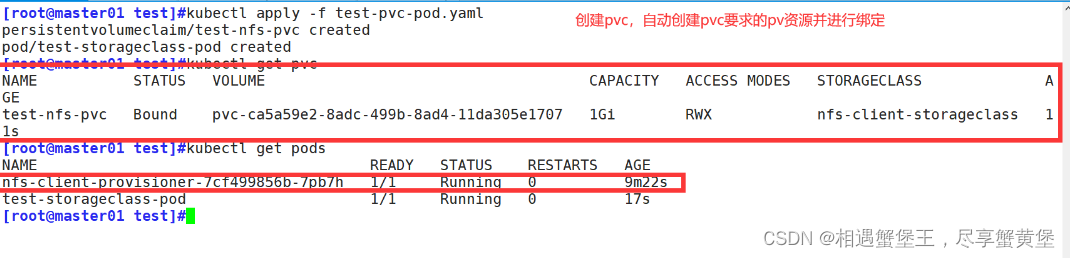 5、创建PVC资源,配置中关联StorageClass资源。创建PVC资源后会在NFS服务器上自动生成相关的PV使用的目录,目录名以<pvc的namespace_name>-<pvc_name>-<pv_name>格式命名