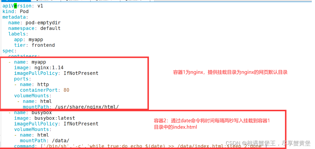 当Pod被分配给节点时,首先创建emptyDir卷,并且只要该Pod在该节点上运行,该卷就会存在。正如卷的名字所述,它最初是空的。Pod 中的容器可以读取和写入emptyDir卷中的相同文件,尽管该卷可以挂载到每个容器中的相同或不同路径上。当出于任何原因从节点中删除 Pod 时,emptyDir中的数据将被永久删除。