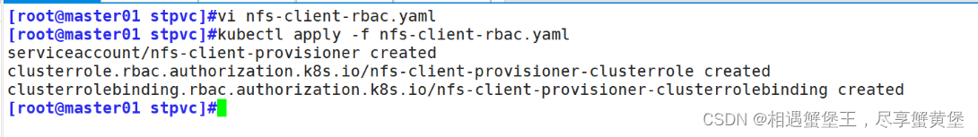 2、创建service account服务账户和RBAC授权,使得sa服务账户具有对PV,PVC,SC等资源的操作权限