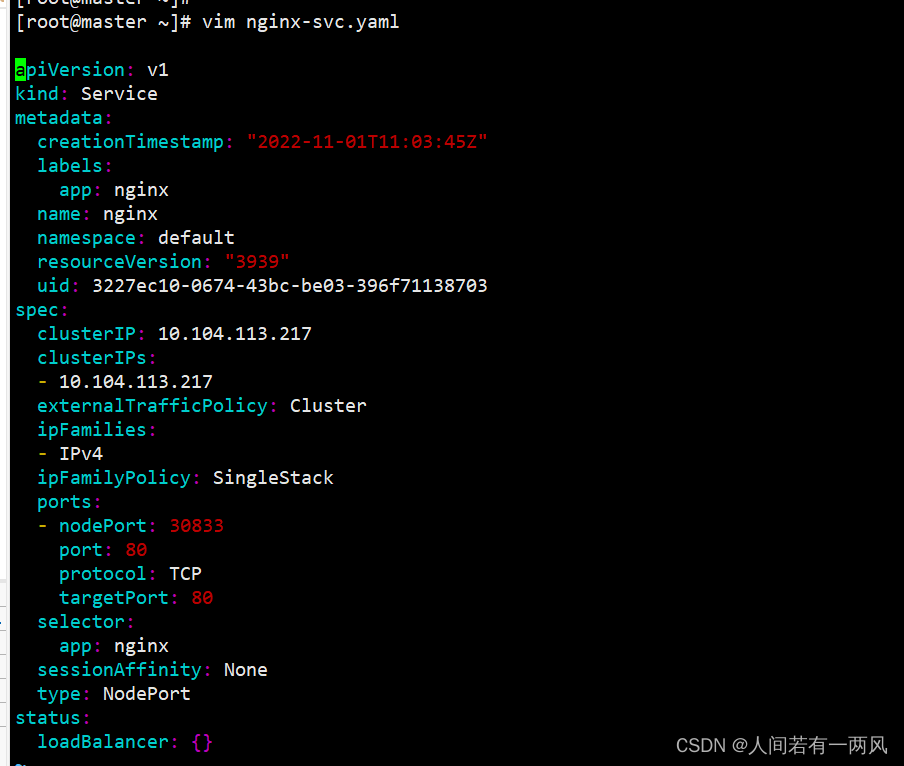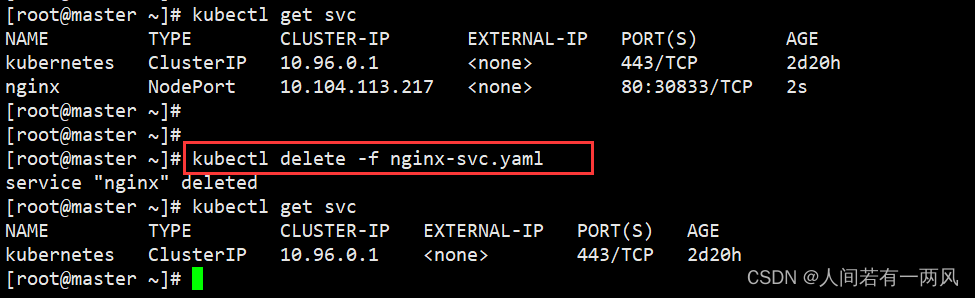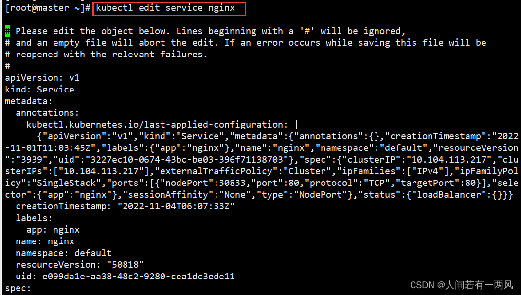 resource可以是具体资源名称,如"pod nhinx-xxx";也可以是资源类型,如“pod,node,svc,deploy”多种资源使用逗号间隔;或者all(仅展示几种核心资源,并不完整)直接使用kubectl edit service nginx-service在线编辑配置资源清单并保存退出即时生效(如port: 888)注意:当apply不生效时,先使用delete清除资源,再appl