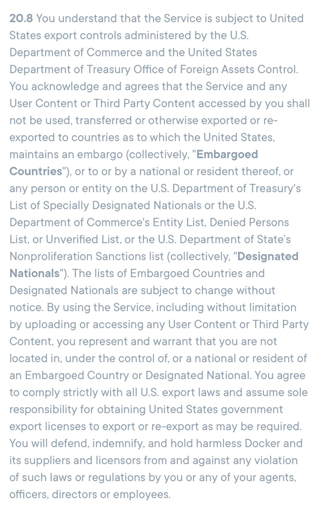 近日,Docker 公司更新了其服务条款,条款的20.8显示,禁止被美国维持禁运的国家(统称为“禁运国家”)以及被列入美国“实体名单”的国家、企业、个人使用,该条款在美国时间2020年8月13日正式生效。