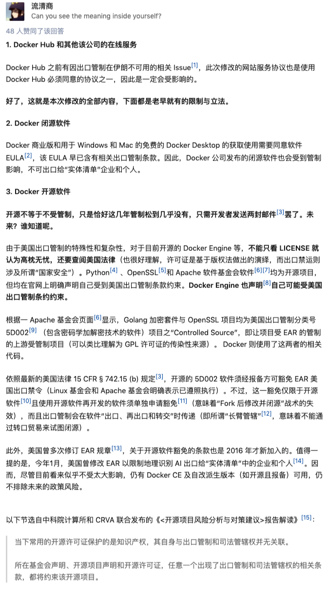 当然,知乎有大佬表示,并不是使用了 Apache License 代表我们可以高枕无忧了,Apache 基金会页面显示,Golang 加密套件与 OpenSSL 项目均为美国出口管制分类号 5D002 (包含密码学加解密技术的软件)项目之“Controlled Source”,即让项目受 EAR 的管制的上游受管制项目(可以类比理解为 GPL 许可证的传染性来源)。Docker 则使用了这两者的相关代码。