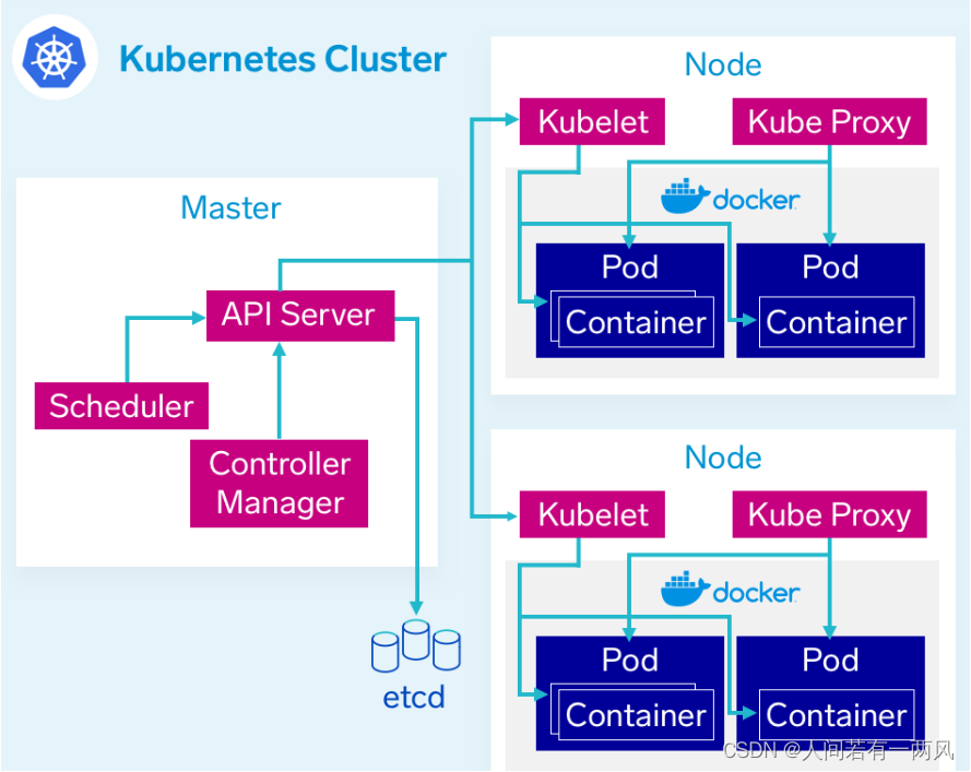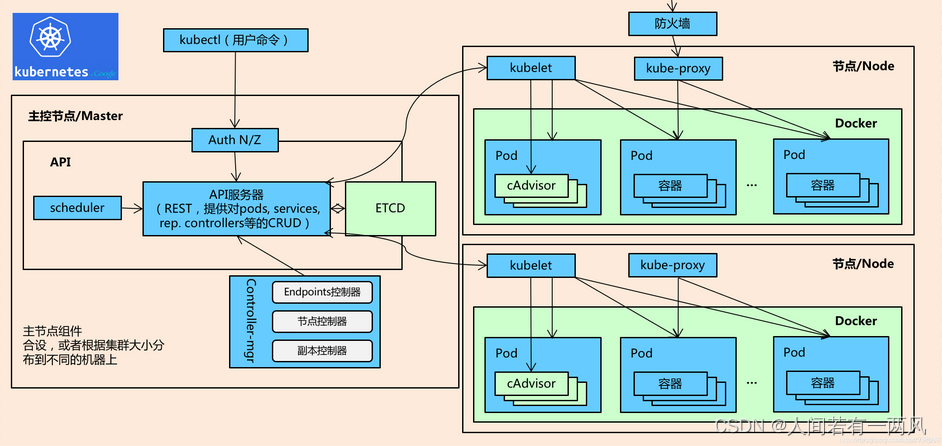 - 可以理解成API Server是K8S的请求入口服务。API Server负责接收K8S所有请求(来自界面或者CLI命令行工具),然后根据用户的具体请求,去通知其他组件干活,可以说API Server是K8S集群架构的大脑