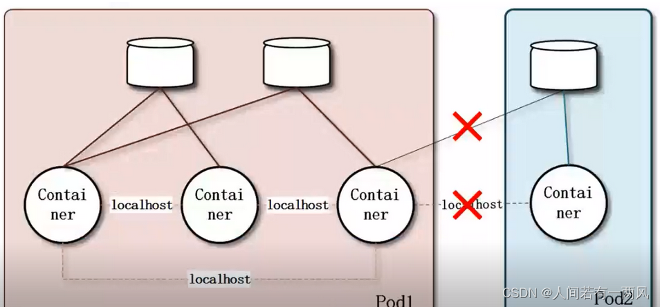 - 同一个 Pod 之间的容器可以通过 localhost 互相访问,并且可以挂载 Pod 内的所有的数据卷;但是不同的 Pod之间的容器不能用 localhost 访问,也不能挂载其他 Pod 的数据卷。