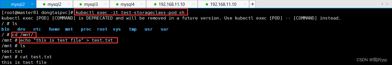 进入 Pod 在挂载目录 /mnt 下写一个文件,然后查看 NFS 服务器上是否存在该文件