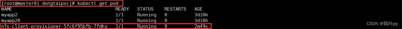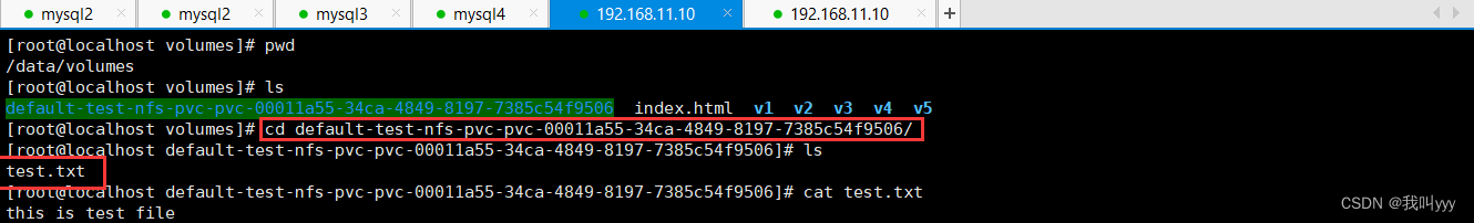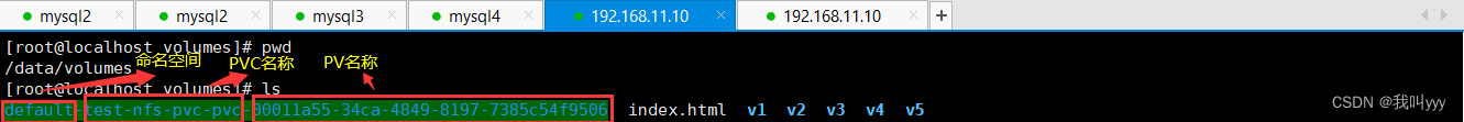 查看 NFS 服务器上是否生成对应的目录,自动创建的 PV 会以 ${namespace}-${pvcName}-${pvName} 的目录格式放到 NFS 服务器上