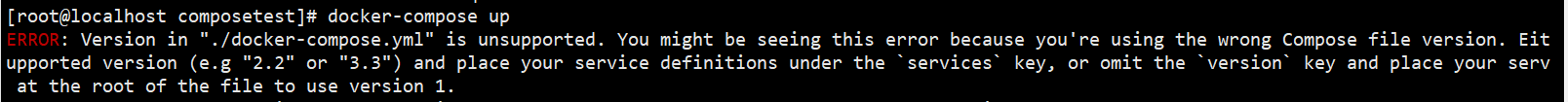 ERROR: Version in "./docker-compose.yml" is unsupported. You might be seeing this error because you're using the wrong Compose file version. Eithupported version (e.g "2.2" or "3.3") and place your service definitions under the `services` key, or omit the `version` key and place your servi at the root of the file to use version 1.