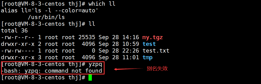 注意:我们这里使用alias为其他指令创建的别名是一种临时效果,即当系统重启后该别名会失效,想要让其永久生效需要进行其他操作。如下图: