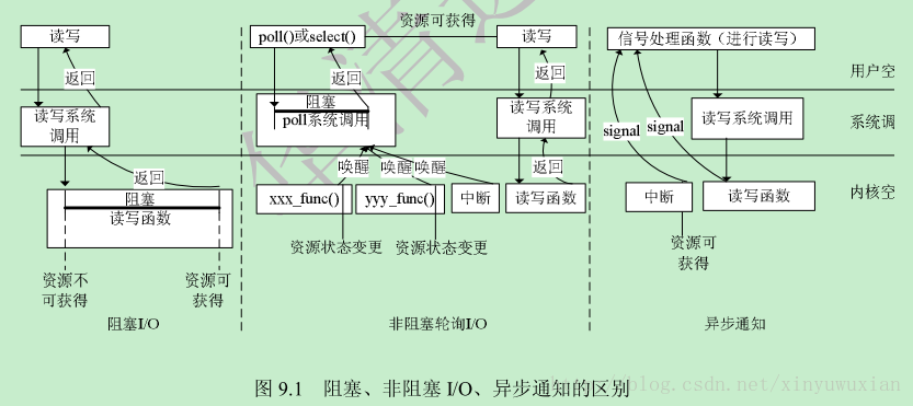 图 9.1 呈现了阻塞 I/O,结合 poll()的非阻塞 I/O 及异步通知在时间先后顺序上的不同。