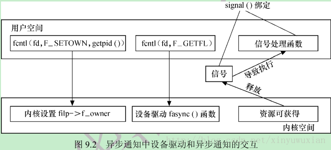 驱动中的上述 3 项工作和应用程序中的 3 项工作是一一对应的,图 9.2 所示为异步通知处理过程中用户空间和设备驱动的交互。