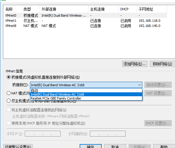 1 设置虚拟机连接方式为桥接此教程根据 网线桥接模式 操作,Wi-Fi操作也是一样的。1.1 虚拟机关闭的状态下,点击“编辑” -> “虚拟网络编辑器”点击“更改设置” 就可以看到桥接模式,其中桥接模式选项有多个,这里你可以选择基于以太网的还是无线局域网的(如果选项只有一个默认自动就可以了)。网线或者无线全部选择:Intel(R) Dual Band Wirele...