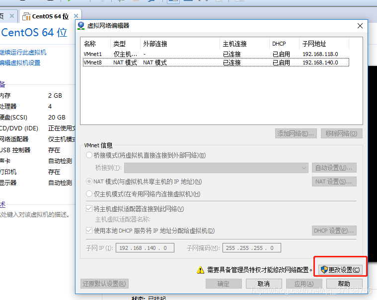 1.1 虚拟机关闭的状态下,点击“编辑” -> “虚拟网络编辑器” 点击“更改设置” 就可以看到桥接模式,其中桥接模式选项有多个,这里你可以选择基于以太网的还是无线局域网的(如果选项只有一个默认自动就可以了)。