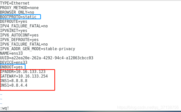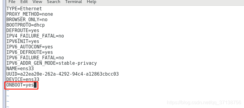3.2 进入编辑模式,修改网卡配置参数ONBOOT=yes