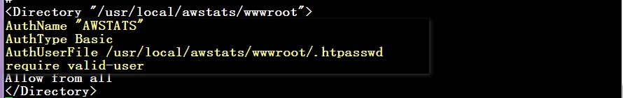 修改 http.conf文件,查找关于awstats的目录区域设置,添加认证授权设置,如下;