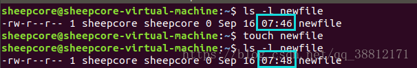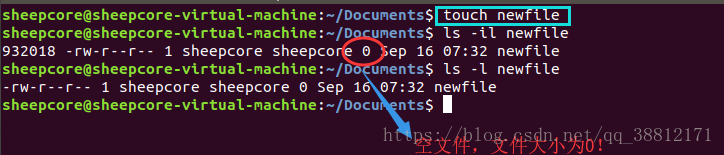 该空文件将会创建在当前路径下,所以我的newfile创建在我的/home/sheepcore/Documents/newfile下;注意图中使用了 ls -i,用于打印系统分配给该空文件的索引结点号。Linux文件系统中每个文件有唯一的索引结点号。