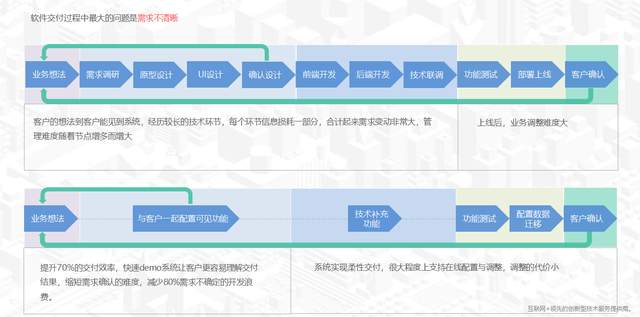 我们找到一个关键点,传统的产品经理或者需求经理 设计原型 需要给客户看设计图或者axure,很多客户看不懂,很难意识到交付的预期效果,那么是否能把产品经理设计原型这个步骤改进为直接配置可见的业务系统,并伴有简单的业务操作逻辑,客户直接上手操作,这样大大缩短前端还原,客户需求确认的过程,客户看到的实际系统更加具象化,需求确认之后的变更大大缩减,从而减少了大量的研发浪费。 当然这个前提要求是产品经理配置的工作量不能太大,门槛不能太高。