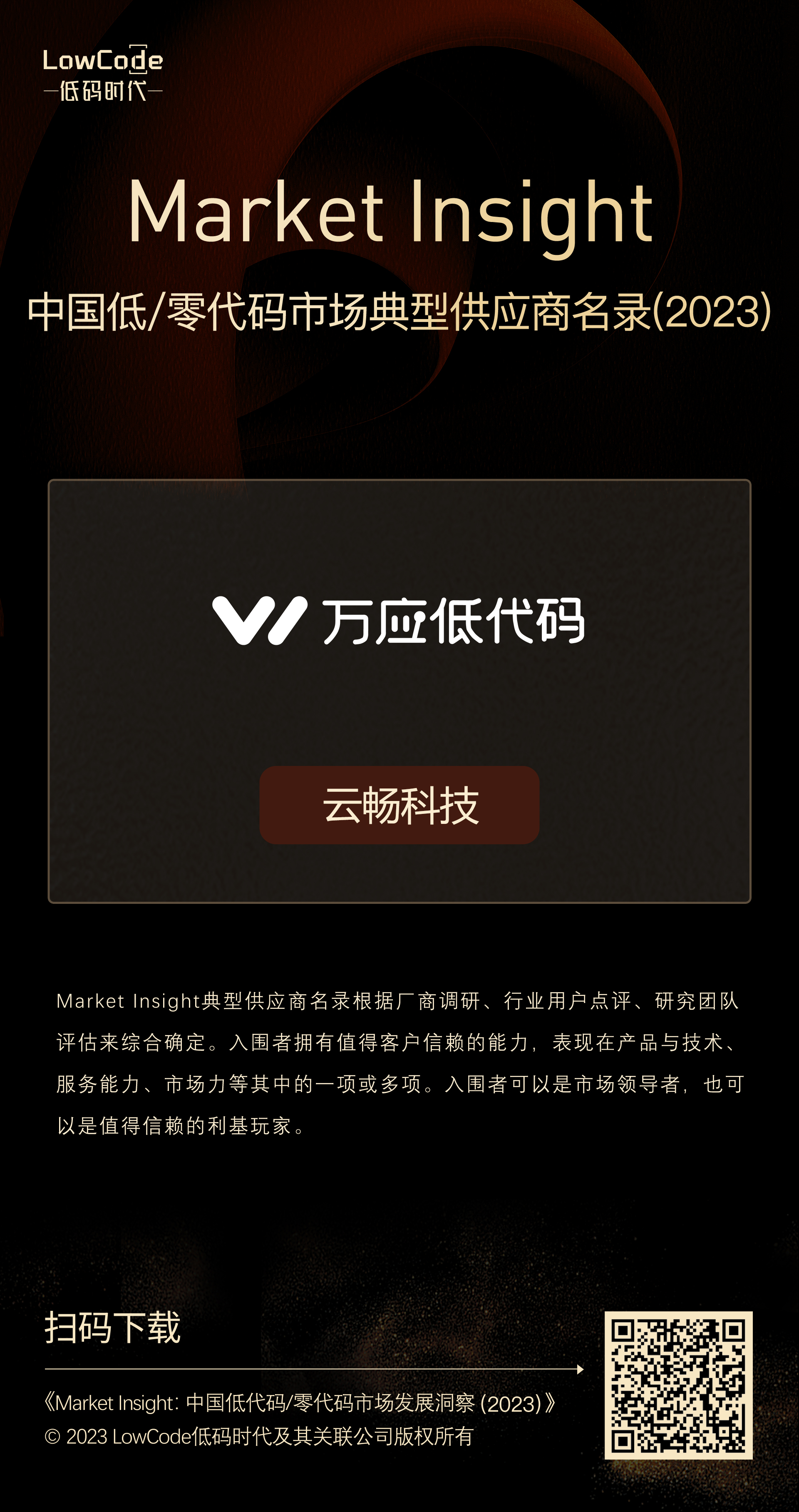 近日,LowCode低码时代发布了《Market Insight:中国低代码/零代码市场发展洞察 ( 2023 )》,万应低代码入选2023 年中国低/零代码市场典型供应商名录。