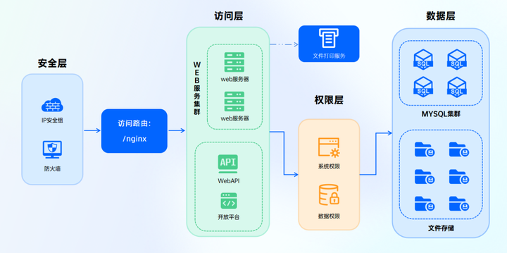 百数本地部署架构采用访问服务集群和mysql数据库集群,能有效保障数据的存储上限和数据处理的性能上限,并且根据用户需求进行自由伸缩。且适配阿里云/腾讯云/华为云/政务云/用户自建机房等多个搭建环境,落地更快。