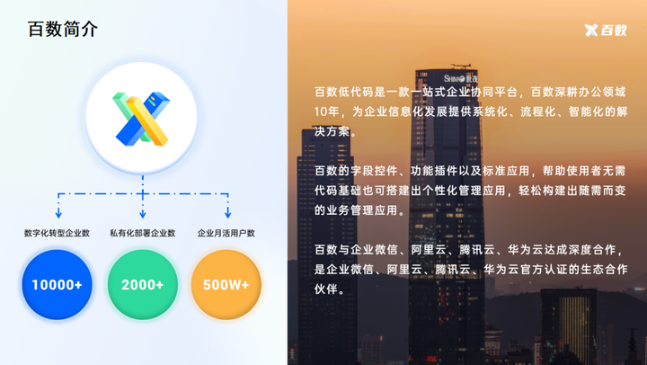 百数是一款在协同办公领域深耕十余年的低代码厂商,为企业信息化发展提供系统化、流程化、智能化的解决方案。与企业微信、阿里云、腾讯云、华为云达成深度合作,是企业微信、阿里云、腾讯云、华为云官方认证的生态合作伙伴。
