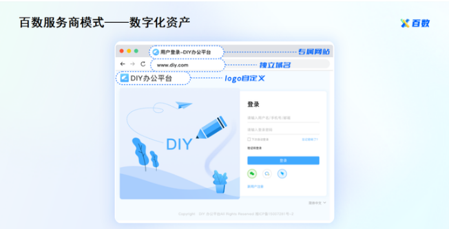 百数服务商模式支持服务商进行域名、logo等品牌化设计,服务商通过品牌建设,可以打造一个在垂直领域同时具备“服务”以及“产品”的低代码平台。而且,不仅如此,为了能让代理商的品牌更具竞争力,在百数还为服务商申请软著提供技术支持。