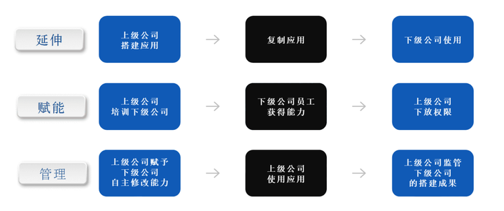 集团企业的部门、业务、上下级关系更多更复杂,所以,通过将复杂的需求进行分解的方式,从上而下地实现全面数字化转型。