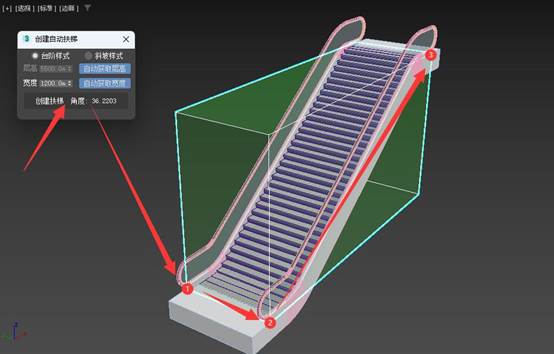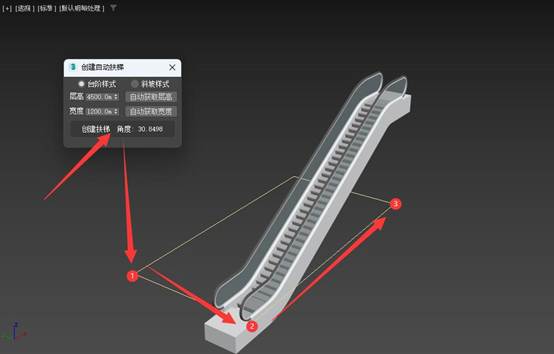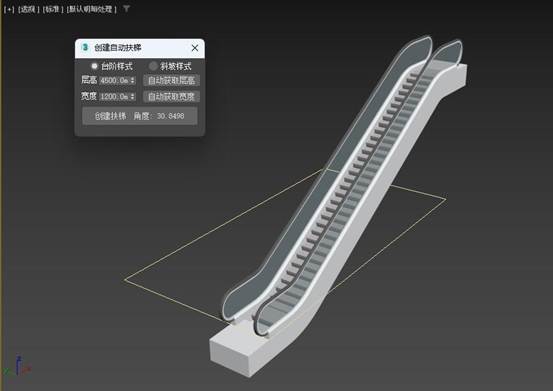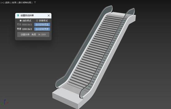 3DMAX创建自动扶梯插件,可以通过3点自动创建扶梯。只需要点击鼠标3下,就可以自动创建一个扶梯模型。也可以在三维捕捉模式下,自动获取长度、宽度和高度来生成扶梯。
