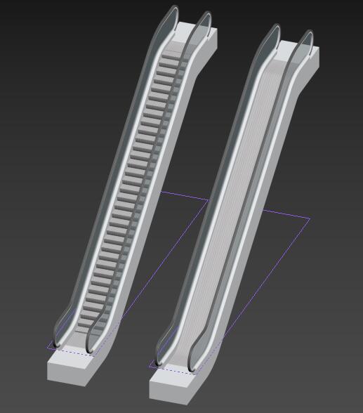 3DMAX创建自动扶梯插件支持两种样式的扶梯:台阶样式(左)和斜坡样式(右)(在超市中我们经常能看到这两种样式的扶梯),在3DMAX创建自动扶梯插件面板的上方进行选择,如图: