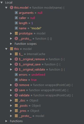 where as in Document middleware this return all fields that you defined not by mongoose so this.model not your defined property. for above example I have name property so you can get that by this.name that will show your requested value. But when use this.contructor then you will return instance variable that are defined by mongoose like return Model instance variable.
