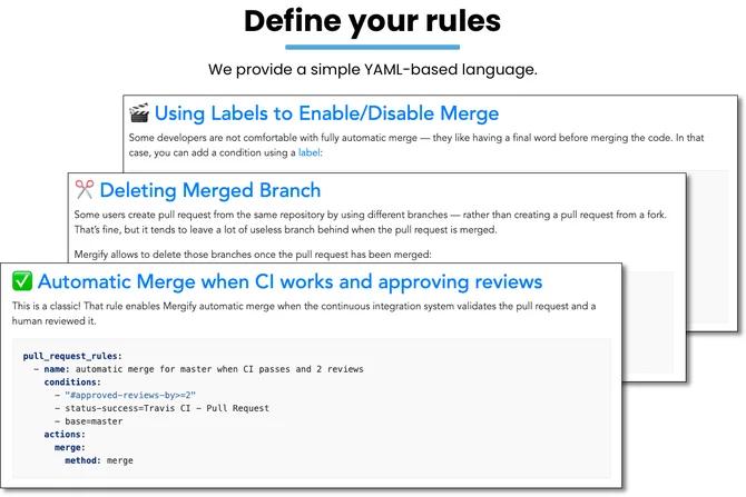 Here is a practical example on how you can define mergify rules and run them. If you want a more in-depth look into how to define the rules, you can check out the documentation.
