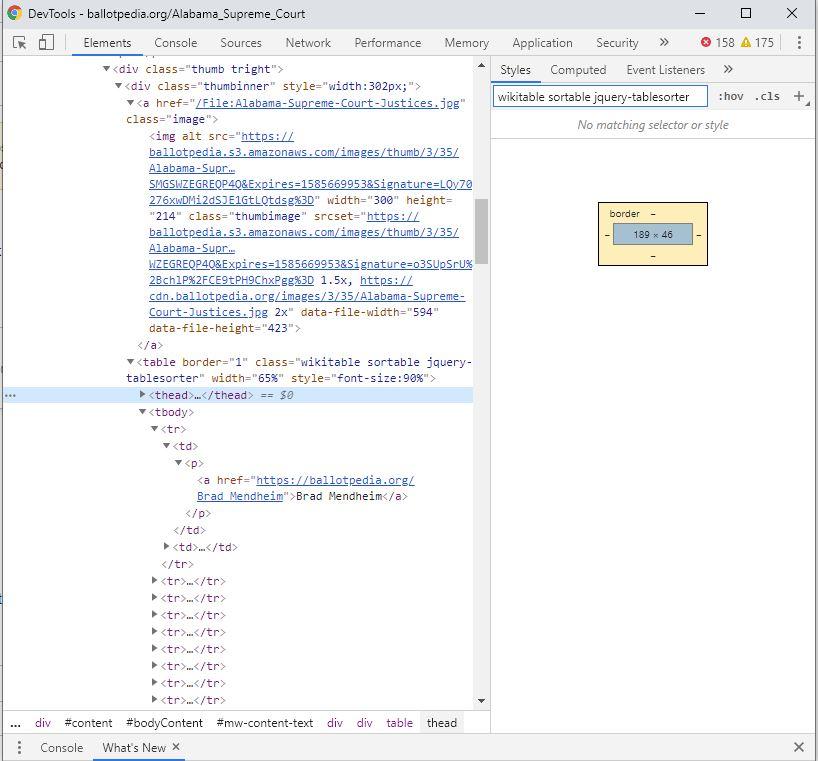 Here is an image of the inspection of the webpage. I am aiming to get the thead to work in my code but am failing!