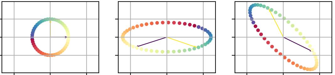 Since whitening our data was done applying a linear transformation, we can apply the same transformation to those points (both arrows and the circle), and visualize how they get transformed: