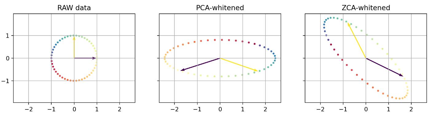 Once again, you can see how PCA and ZCA are just a rotation appart. Also notice the general direction of the colors on the circle.