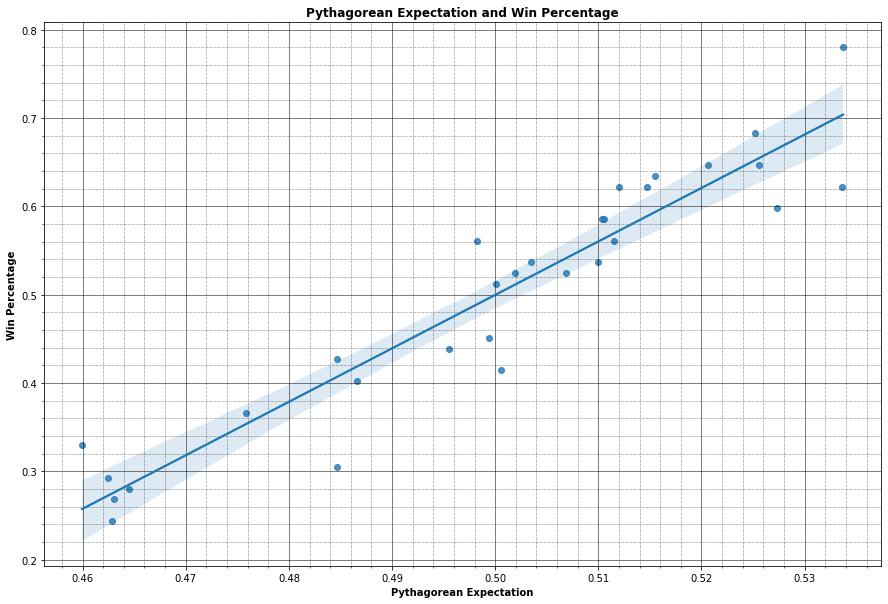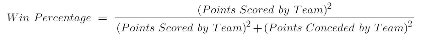 在这里,等式的 RHS 是毕达哥拉斯期望。因此,从本质上讲,球队得分和失分被用来估计球队的获胜百分比。这意味着毕达哥拉斯期望与团队的获胜百分比有很强的相关性。