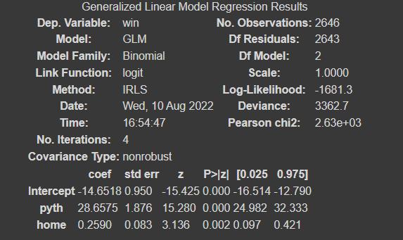 变量“pyth”表示每场比赛的累积毕达哥拉斯期望,以及“主场”变量(表示相关球队是否在主场比赛,即主场 u003d 1 表示主场比赛,0 表示客场比赛),成为自变量。