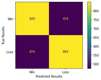 使用在对战完成前从 ELO 评分中获得的获胜概率,我们可以确定相关球队是否赢得比赛(即如果相关球队的获胜概率大于 0.5,则他们是预计会赢得比赛)。应用此逻辑,可以获得每场比赛的结果,并可以使用混淆矩阵将其与实际比赛结果进行比较。这可以用来估计 ELO 评级系统的准确性。