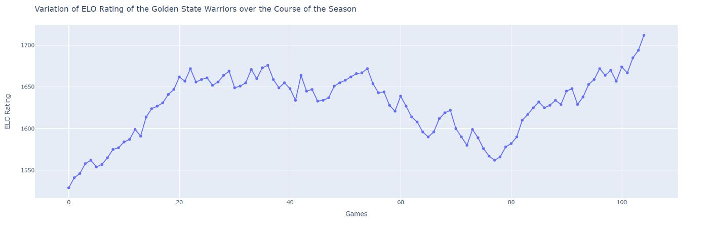 让我们看看金州勇士队在 2021-22 NBA 赛季的 ELO 等级变化