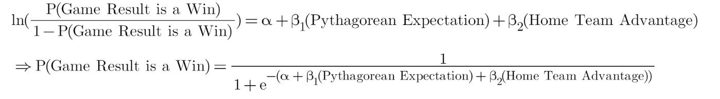 进一步扩展这一点,我们可以使用毕达哥拉斯期望来预测每支球队在常规赛和季后赛中的比赛结果。为此,我们使用 logit 模型。该模型本质上是根据自变量(即毕达哥拉斯期望和主队优势)计算球队获胜几率的自然对数。