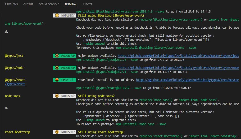 ‘npm install -g npm-check’ or ‘yarn add npm-check’.