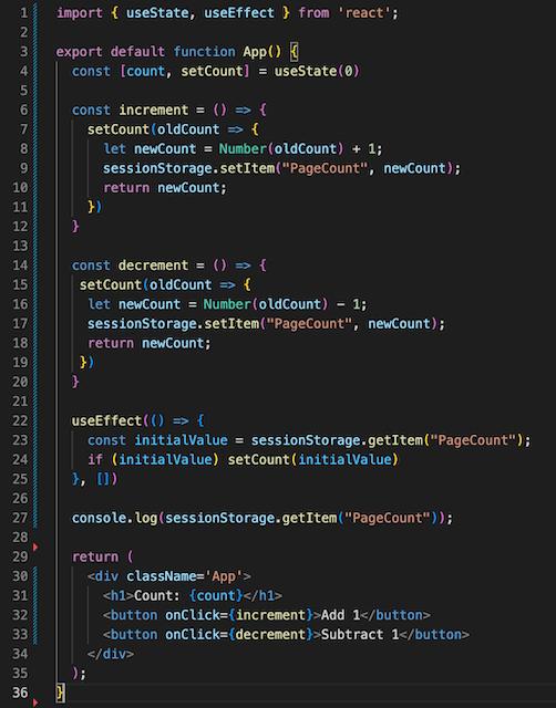 On every render, I am assigning the value of the PageCount key inside sessionStorage to an initialValue variable, then updating the count state variable to whatever that value is. Now, whenever the browser is refreshed, the counter will display whatever the value of PageCount is, controlled by the increment and decrement functions.